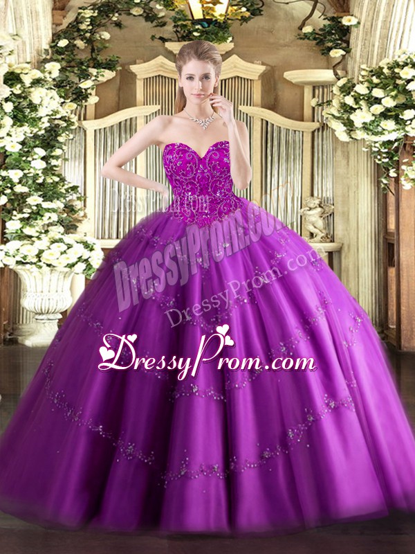 Neckline : SweetheartShown Color : FuchsiaSilhouette : Ball GownsSleeve Length : sleevelessHemline : floor lengthBack Detail : Lace upFabric : TulleEmbellishment : BeadingOccasion : Military Ball,Sweet 16,QuinceaneraSeason : Spring,Summer,Fall,Winter