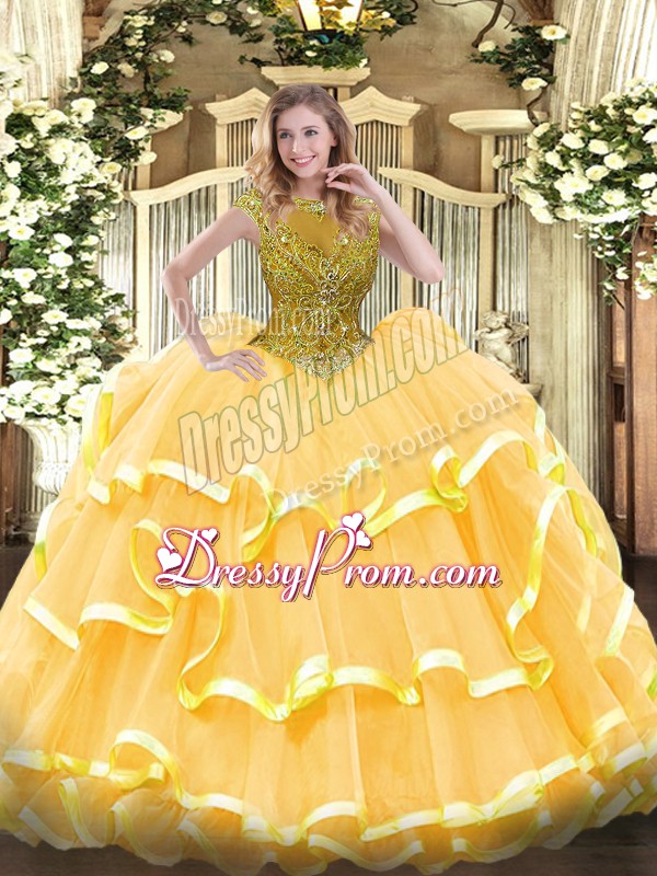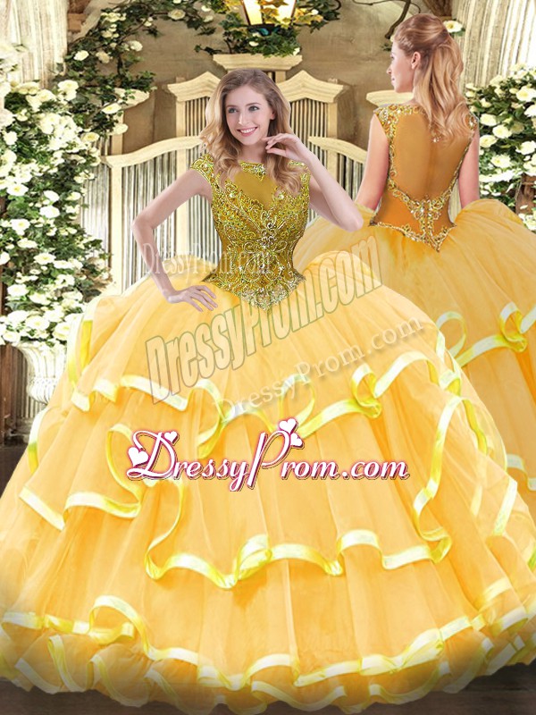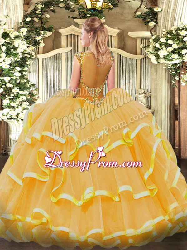 Neckline : ScoopShown Color : GoldSilhouette : Ball GownsSleeve Length : cap sleevesHemline : floor lengthBack Detail : ZipperFabric : OrganzaEmbellishment : Beading,Ruffled LayersOccasion : Sweet 16,QuinceaneraSeason : Spring,Summer,Fall,Winter