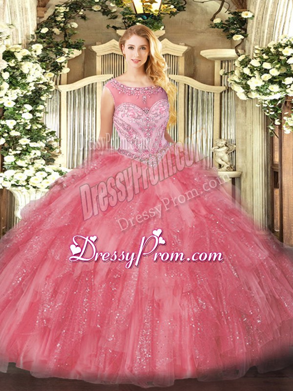 Neckline : ScoopShown Color : Rose Pink Silhouette : Ball GownsSleeve Length : sleevelessBack Detail : ZipperFabric : OrganzaEmbellishment : Beading,RufflesOccasion : Sweet 16,QuinceaneraSeason : Spring,Summer,Fall,Winter