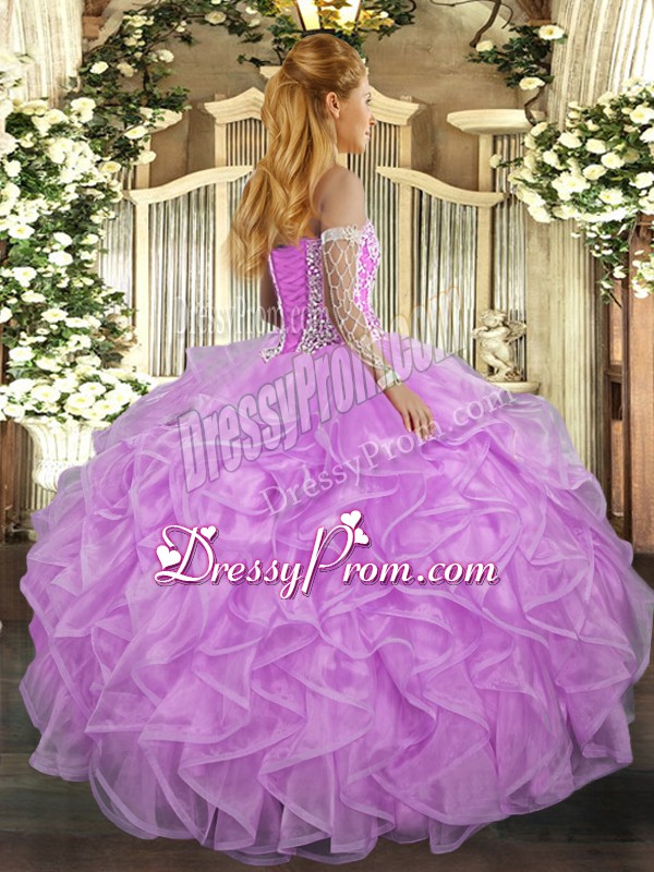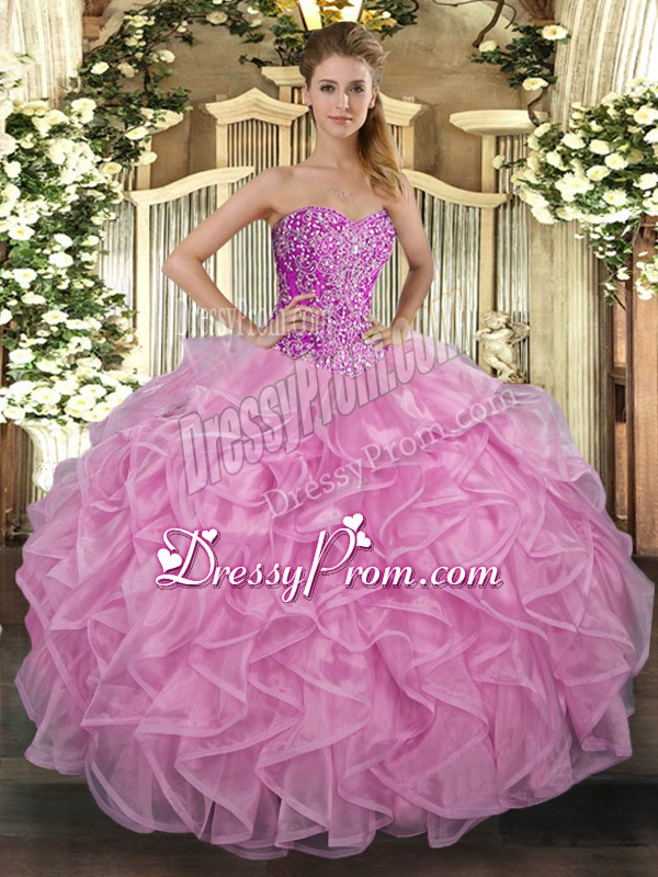 Neckline : SweetheartShown Color : Rose Pink Silhouette : Ball GownsSleeve Length : sleevelessHemline : floor lengthBack Detail : Lace upFabric : TulleEmbellishment : Beading,RufflesOccasion : Military Ball,Sweet 16,QuinceaneraSeason : Spring,Summer,Fall,Winter