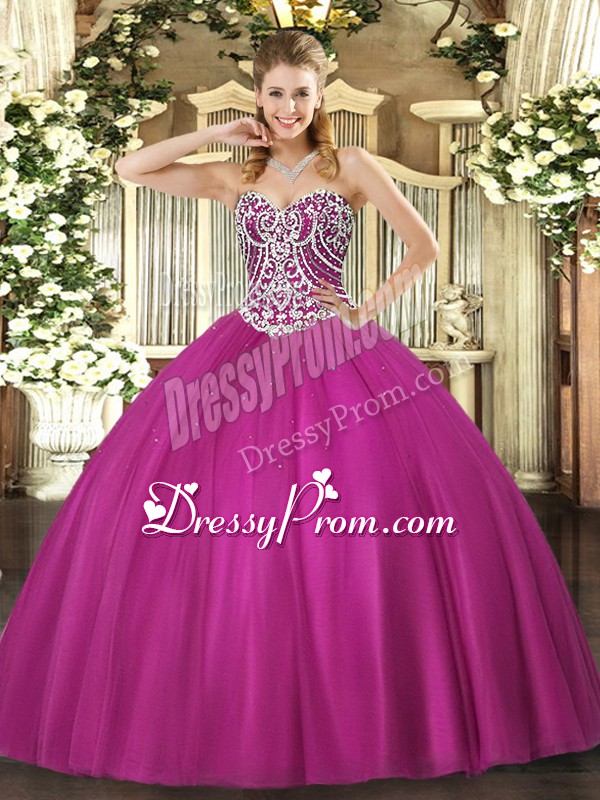 Neckline : SweetheartShown Color : FuchsiaSilhouette : Ball GownsSleeve Length : sleevelessHemline : floor lengthBack Detail : Lace upFabric : TulleEmbellishment : BeadingOccasion : Military Ball,Sweet 16,QuinceaneraSeason : Spring,Summer,Fall,Winter