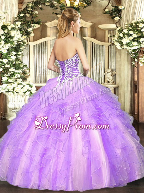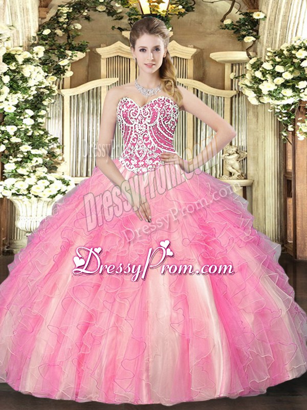 Neckline : SweetheartShown Color : Rose Pink Silhouette : Ball GownsSleeve Length : sleevelessHemline : floor lengthBack Detail : Lace upFabric : TulleEmbellishment : Beading,RufflesOccasion : Military Ball,Sweet 16,QuinceaneraSeason : Spring,Summer,Fall,Winter
