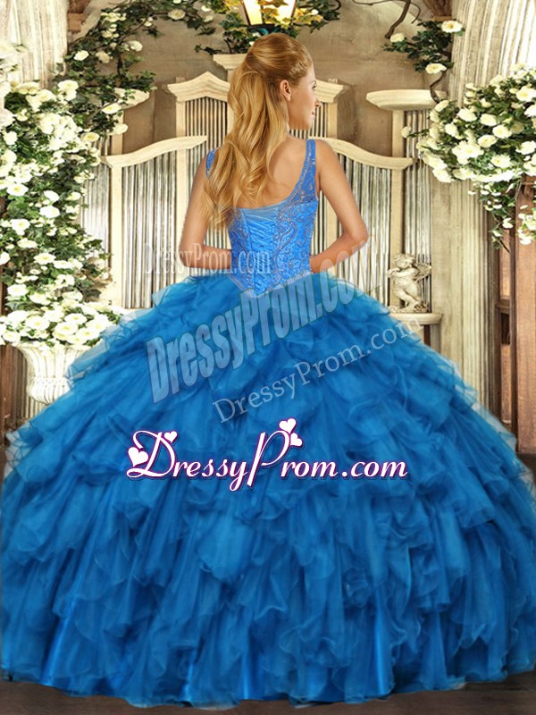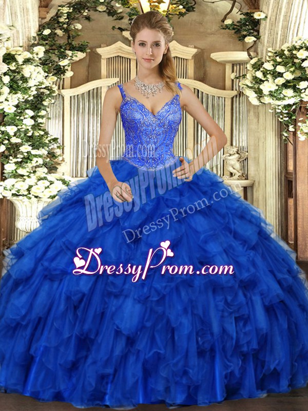 Neckline : V-neckShown Color : Royal BlueSilhouette : Ball GownsSleeve Length : sleevelessHemline : floor lengthBack Detail : Lace upFabric : OrganzaEmbellishment : Beading,RufflesOccasion : Military Ball,Sweet 16,QuinceaneraSeason : Spring,Summer,Fall,Winter