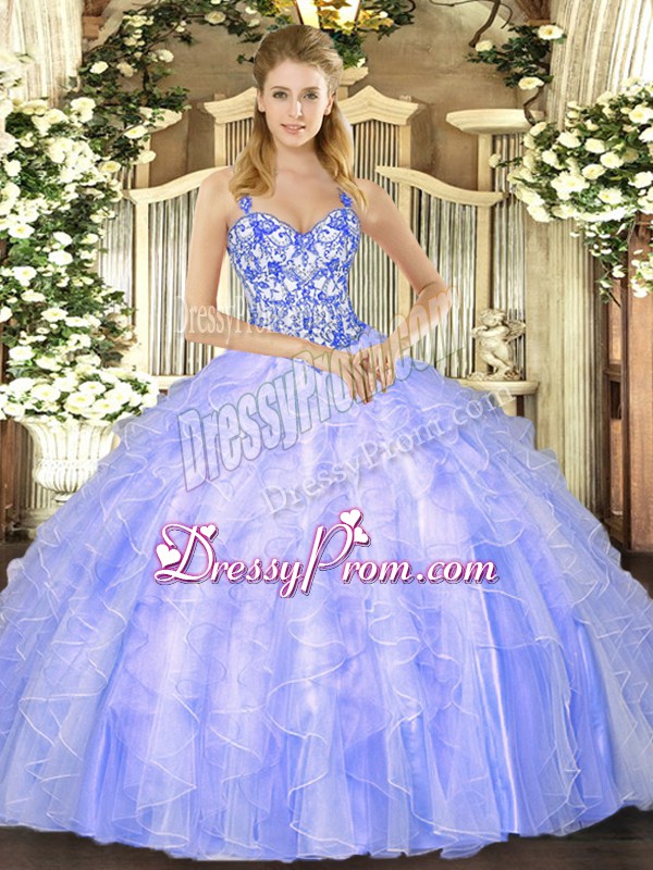 Neckline : StrapsShown Color : LavenderSilhouette : Ball GownsSleeve Length : sleevelessHemline : floor lengthBack Detail : Lace upFabric : OrganzaEmbellishment : Beading,RufflesOccasion : Sweet 16,QuinceaneraSeason : Spring,Summer,Fall,Winter
