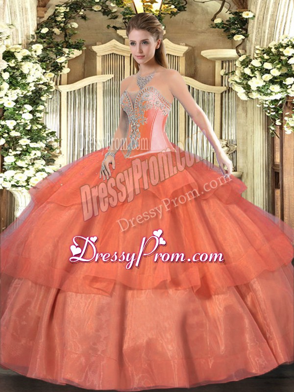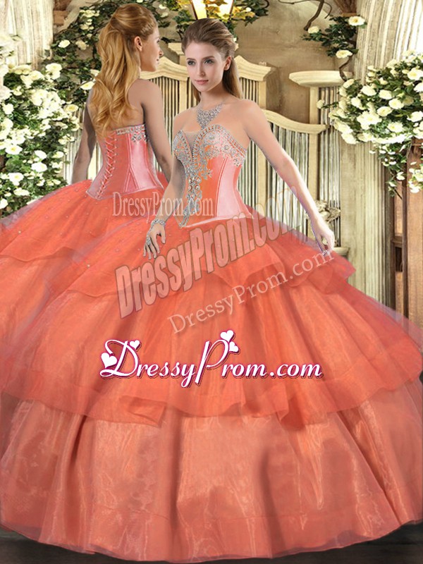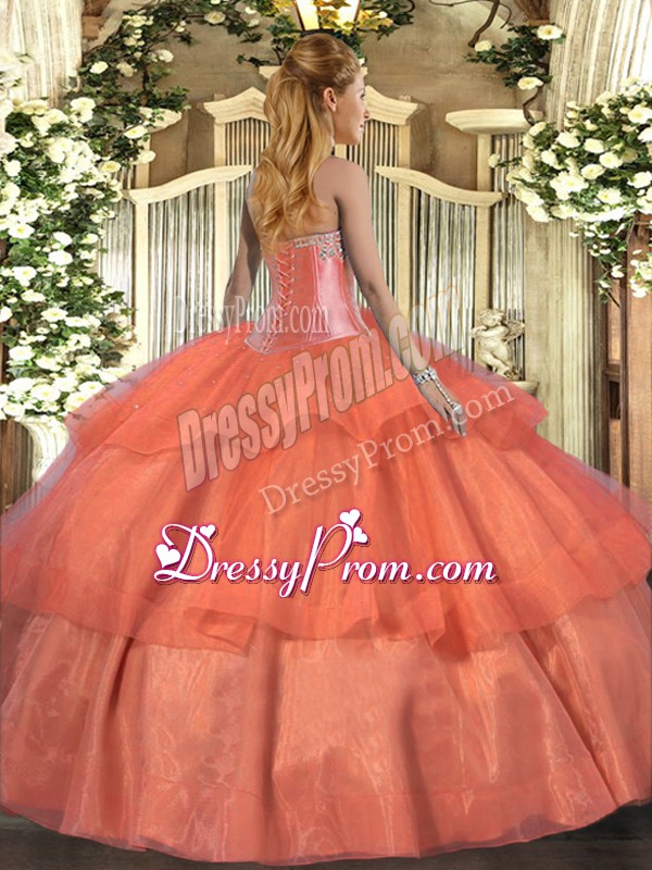 Neckline : SweetheartShown Color : Coral RedSilhouette : Ball GownsSleeve Length : sleevelessHemline : floor lengthBack Detail : Lace upFabric : TulleEmbellishment : Beading,Ruffled LayersOccasion : Military Ball,Sweet 16,QuinceaneraSeason : Spring,Summer,Fall,Winter