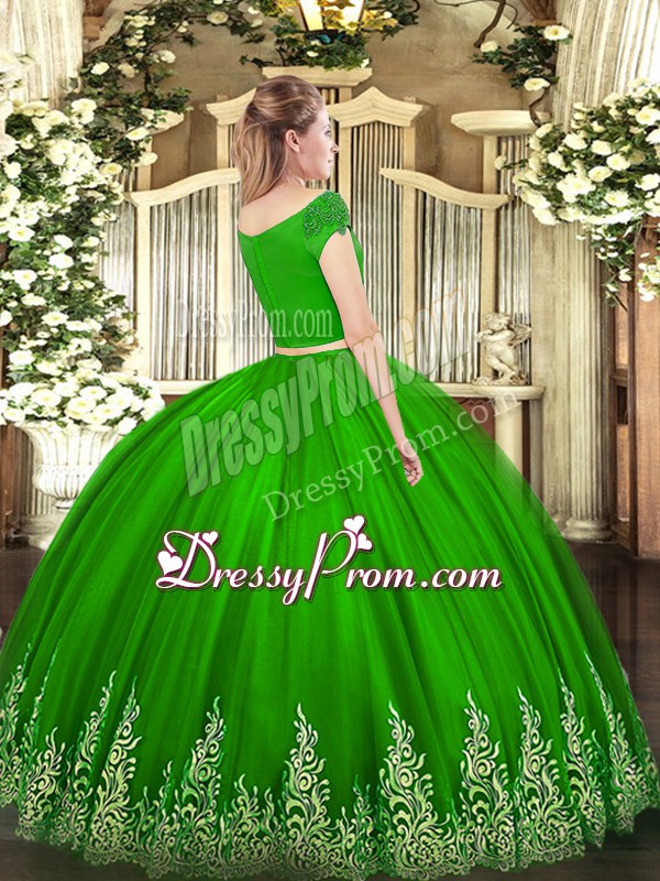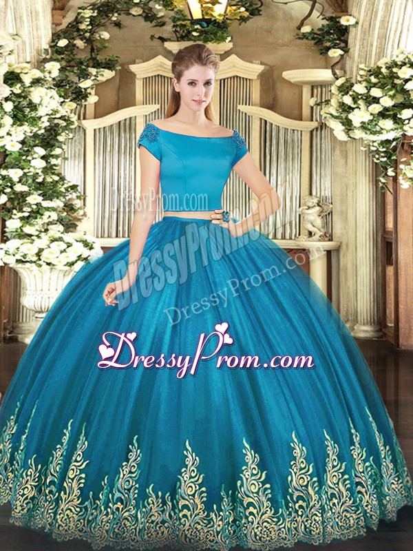 Neckline : Off the shoulder Shown Color : Teal Silhouette : Two Pieces Sleeve Length : short sleeves Hemline : floor length Back Detail : Zipper Fabric : Tulle Embellishment : Appliques Occasion : Military Ball,Sweet 16,Quinceanera Season : Spring,Summer,Fall,Winter