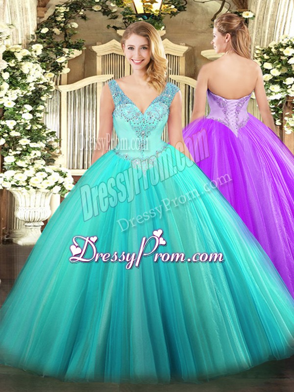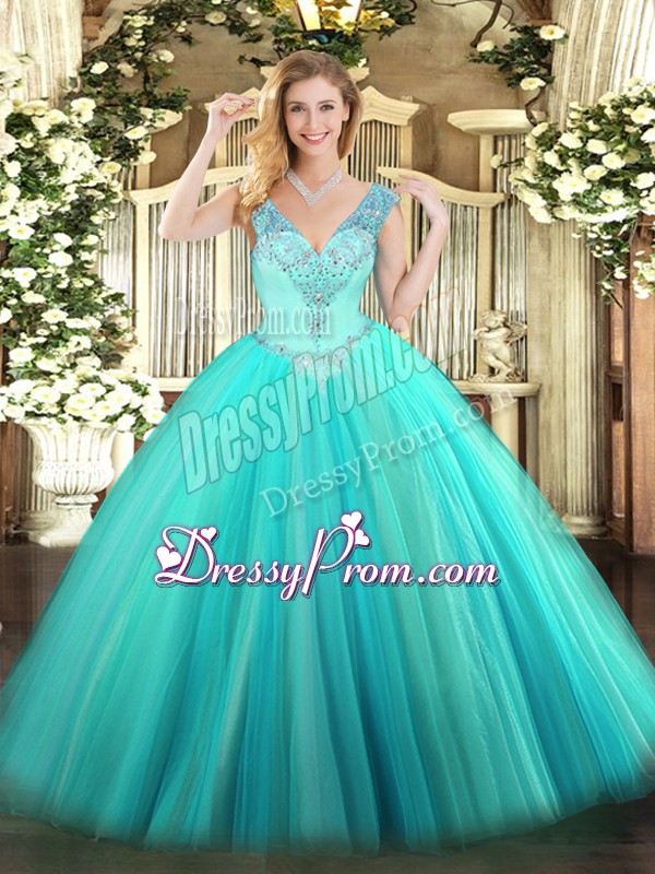 Neckline : V-neckShown Color : Aqua BlueSilhouette : Ball GownsSleeve Length : sleevelessHemline : floor lengthBack Detail : Lace upFabric : TulleEmbellishment : BeadingOccasion : Military Ball,Sweet 16,QuinceaneraSeason : Spring,Summer,Fall,Winter