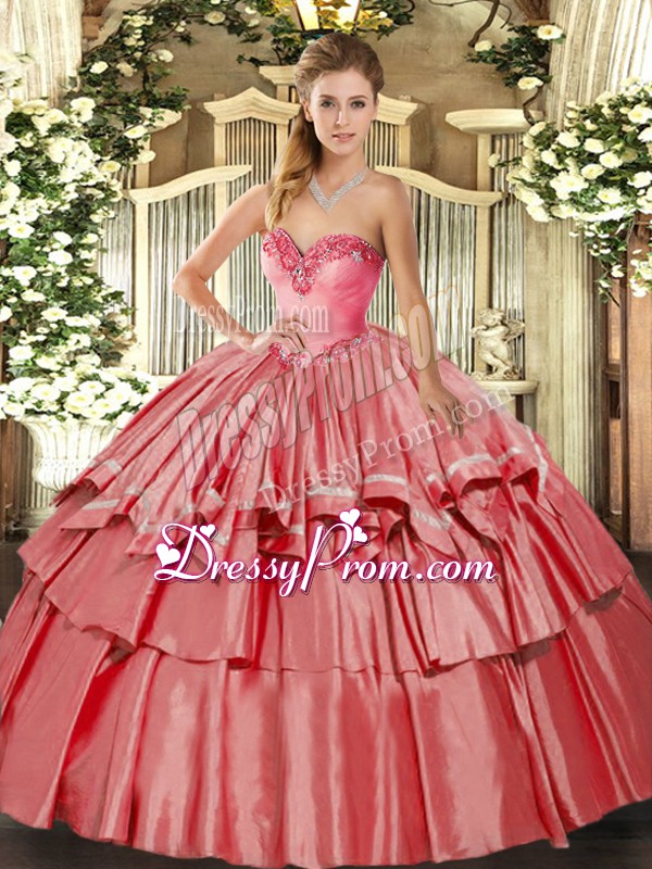 Neckline : SweetheartShown Color : Coral RedSilhouette : Ball GownsSleeve Length : sleevelessHemline : floor lengthBack Detail : Lace upFabric : Organza,TaffetaEmbellishment : Beading,Ruffled LayersOccasion : Military Ball,Sweet 16,QuinceaneraSeason : Spring,Summer,Fall,Winter