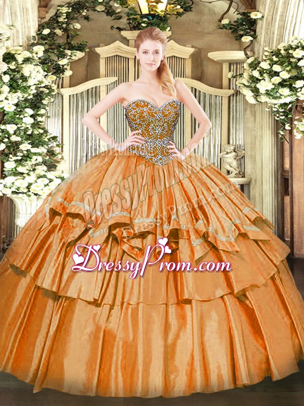 Neckline : SweetheartShown Color : OrangeSilhouette : Ball GownsSleeve Length : sleevelessHemline : floor lengthBack Detail : Lace upFabric : OrganzaEmbellishment : Beading,Ruffled LayersOccasion : Military Ball,Sweet 16,QuinceaneraSeason : Spring,Summer,Fall,Winter