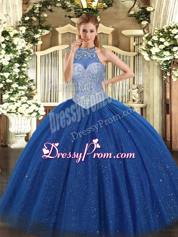Neckline : Halter top Shown Color : Royal Blue Silhouette : Ball Gowns Sleeve Length : sleeveless Hemline : floor length Back Detail : Lace up Fabric : Tulle Embellishment : Beading Occasion : Military Ball,Sweet 16,Quinceanera Season : Spring,Summer,Fall,Winter