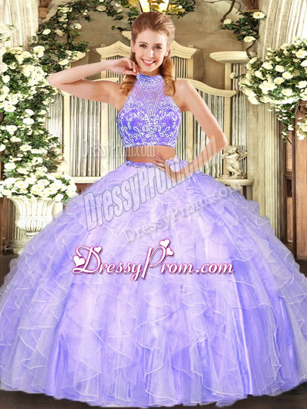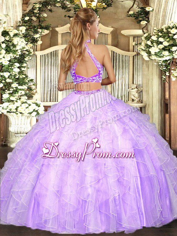 Neckline : Halter topShown Color : LavenderSilhouette : Two PiecesSleeve Length : sleevelessHemline : floor lengthBack Detail : Criss crossFabric : TulleEmbellishment : Beading,RufflesOccasion : Military Ball,Sweet 16,QuinceaneraSeason : Spring,Summer,Fall,Winter