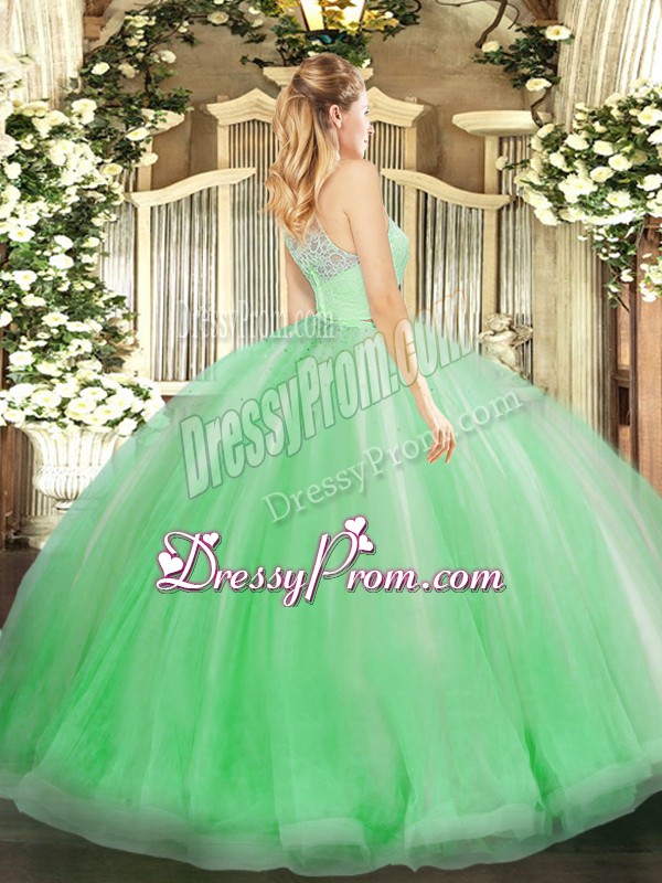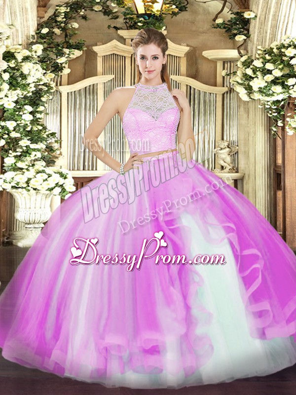 Neckline : ScoopShown Color : LilacSilhouette : Two PiecesSleeve Length : sleevelessHemline : floor lengthBack Detail : ZipperFabric : TulleEmbellishment : Lace,RufflesOccasion : Military Ball,Sweet 16,QuinceaneraSeason : Spring,Summer,Fall,Winter