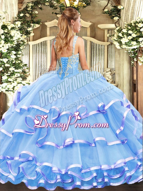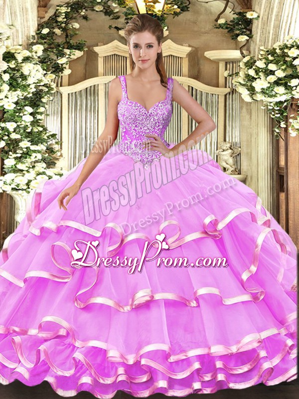 Neckline : StrapsShown Color : LilacSilhouette : Ball GownsSleeve Length : sleevelessHemline : floor lengthBack Detail : Lace upFabric : OrganzaEmbellishment : Beading,Ruffled LayersOccasion : Military Ball,Sweet 16,QuinceaneraSeason : Spring,Summer,Fall,Winter