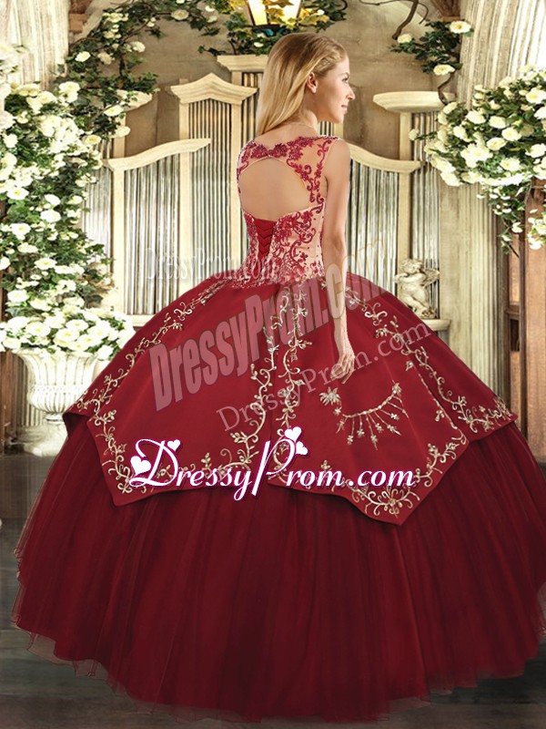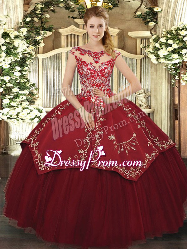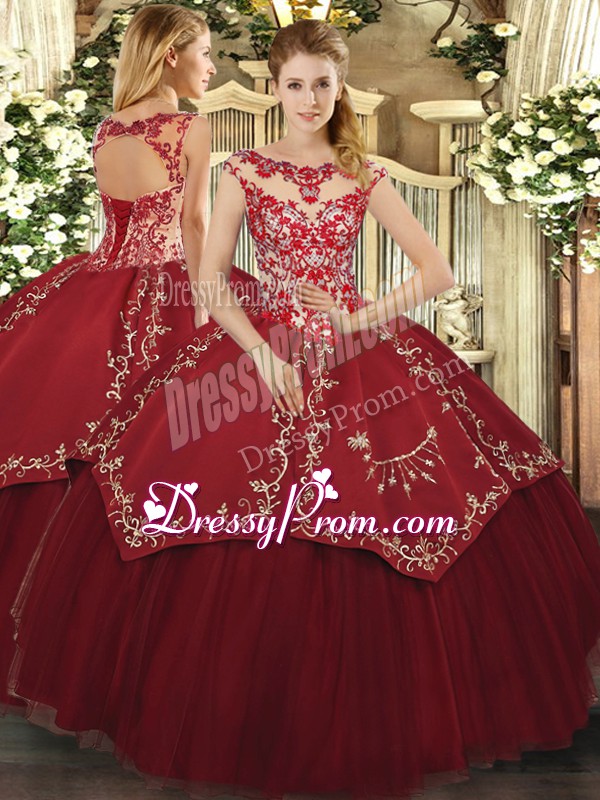 Neckline : ScoopShown Color : Wine RedSilhouette : Ball GownsSleeve Length : cap sleevesHemline : floor lengthBack Detail : Lace upFabric : Satin,TulleEmbellishment : Beading,Appliques,EmbroideryOccasion : Sweet 16,QuinceaneraSeason : Spring,Summer,Fall,Winter