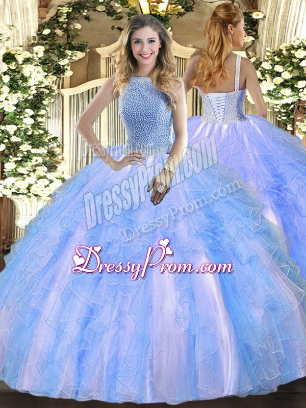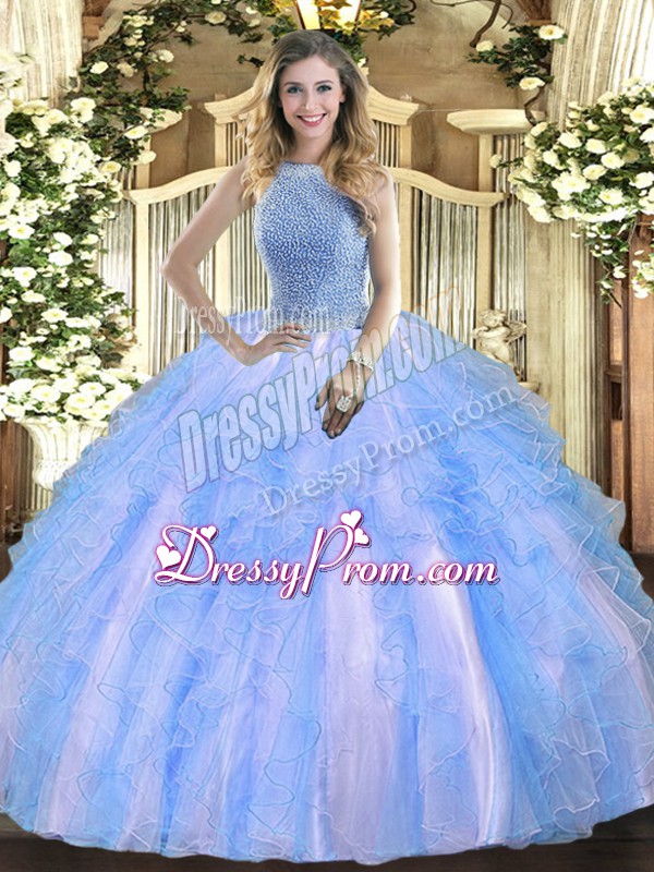 Neckline : High-neckShown Color : Baby BlueSilhouette : Ball GownsSleeve Length : sleevelessHemline : floor lengthBack Detail : Lace upFabric : TulleEmbellishment : Beading,RufflesOccasion : Military Ball,Sweet 16,QuinceaneraSeason : Spring,Summer,Fall,Winter