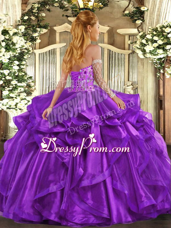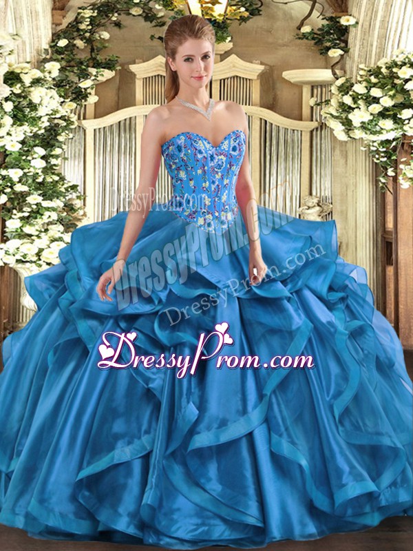 Neckline : SweetheartShown Color : BlueSilhouette : Ball GownsSleeve Length : sleevelessHemline : floor lengthBack Detail : Lace upFabric : OrganzaEmbellishment : Embroidery,RufflesOccasion : Military Ball,Sweet 16,QuinceaneraSeason : Spring,Summer,Fall,Winter