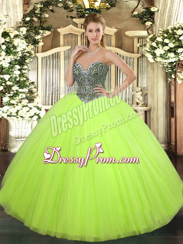 Neckline : SweetheartShown Color : Yellow GreenSilhouette : Ball GownsSleeve Length : sleevelessHemline : floor lengthBack Detail : Lace upFabric : TulleEmbellishment : BeadingOccasion : Military Ball,Sweet 16,QuinceaneraSeason : Spring,Summer,Fall,Winter