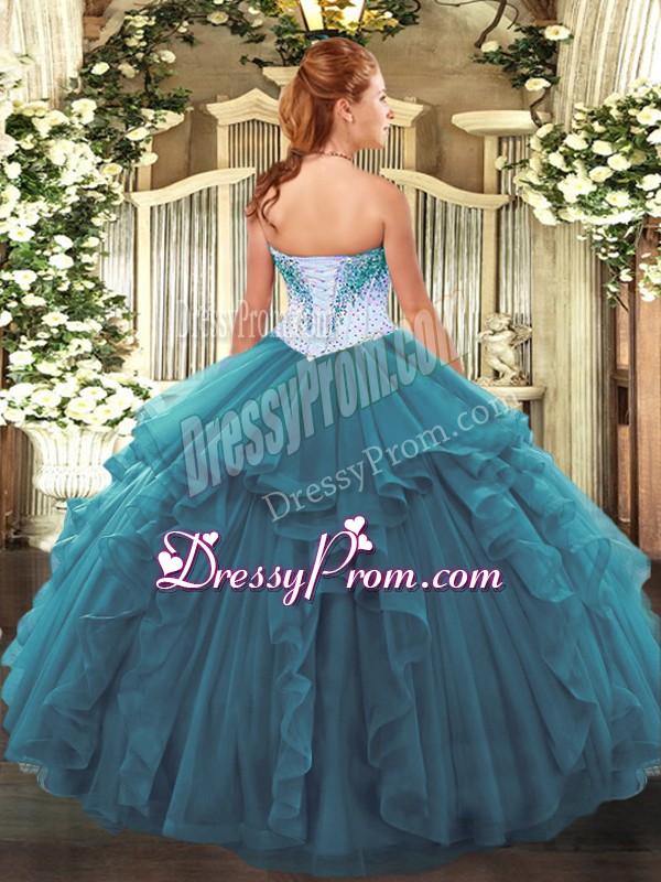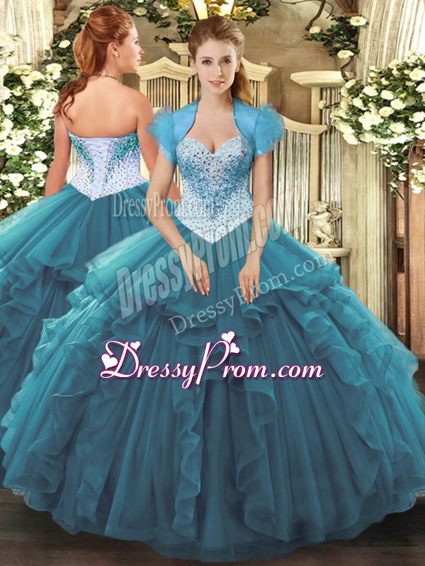 Neckline : SweetheartShown Color : Teal Silhouette : Ball GownsSleeve Length : sleevelessHemline : floor lengthBack Detail : Lace upFabric : TulleEmbellishment : Beading,RufflesOccasion : Military Ball,Sweet 16,QuinceaneraSeason : Spring,Summer,Fall,Winter