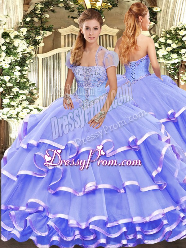 Neckline : StraplessShown Color : LavenderSilhouette : Ball GownsSleeve Length : sleevelessHemline : floor lengthBack Detail : Lace upFabric : OrganzaEmbellishment : Appliques,Ruffled LayersOccasion : Military Ball,Sweet 16,QuinceaneraSeason : Spring,Summer,Fall,Winter