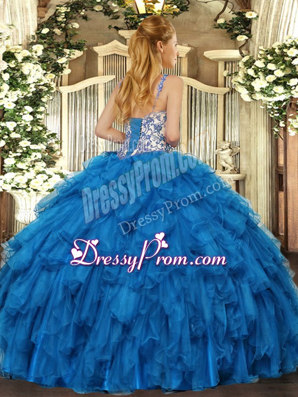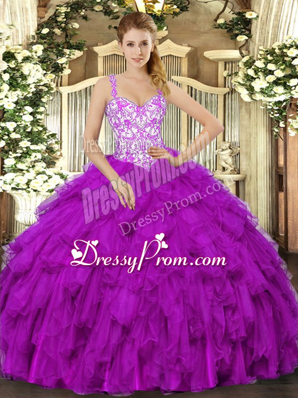 Neckline : StrapsShown Color : FuchsiaSilhouette : Ball GownsSleeve Length : sleevelessHemline : floor lengthBack Detail : Lace upFabric : OrganzaEmbellishment : Beading,Appliques,RufflesOccasion : Sweet 16,QuinceaneraSeason : Spring,Summer,Fall,Winter
