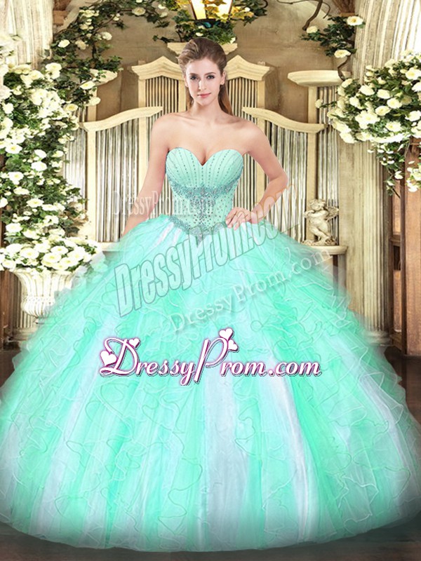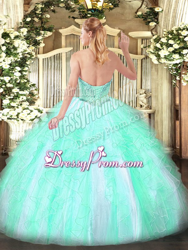 Neckline : SweetheartShown Color : Apple GreenSilhouette : Ball GownsSleeve Length : sleevelessHemline : floor lengthBack Detail : Lace upFabric : TulleEmbellishment : Beading,RufflesOccasion : Military Ball,Sweet 16,QuinceaneraSeason : Spring,Summer,Fall,Winter