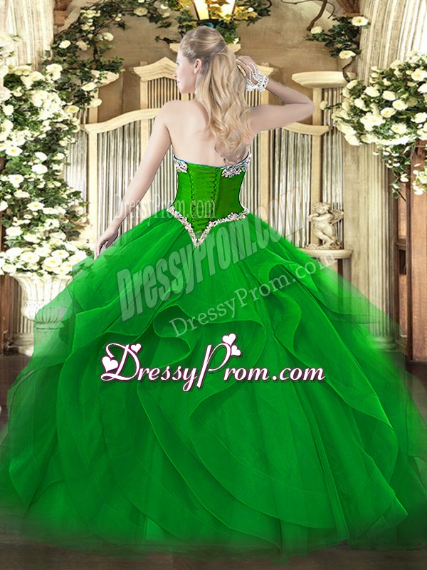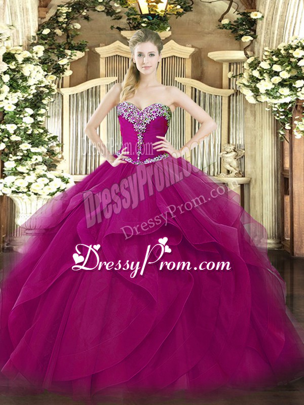 Luxury Tulle Sweetheart Sleeveless Lace Up Beading and Ruffles Quinceanera Dress in Fuchsia