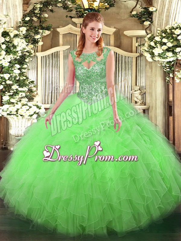 Neckline : ScoopShown Color : Spring GreenSilhouette : Ball GownsSleeve Length : sleevelessHemline : floor lengthBack Detail : Lace upFabric : TulleEmbellishment : Beading,RufflesOccasion : Military Ball,Sweet 16,QuinceaneraSeason : Spring,Summer,Fall,Winter