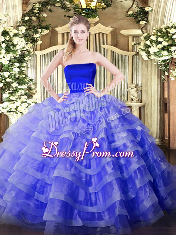 Neckline : StraplessShown Color : BlueSilhouette : Ball GownsSleeve Length : sleevelessHemline : floor lengthBack Detail : ZipperFabric : TulleEmbellishment : Ruffled LayersOccasion : Military Ball,Sweet 16,QuinceaneraSeason : Spring,Summer,Fall,Winter