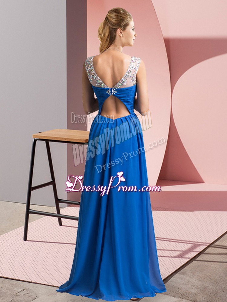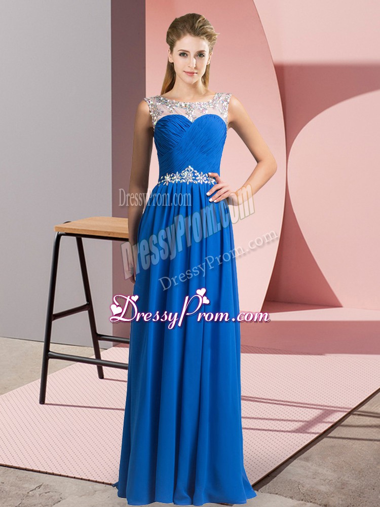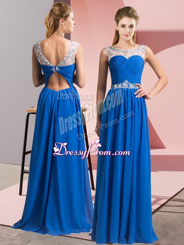 Neckline : ScoopShown Color : BlueSilhouette : EmpireSleeve Length : sleevelessHemline : floor lengthBack Detail : Clasp handleFabric : ChiffonEmbellishment : BeadingOccasion : Prom,PartySeason : Spring,Summer,Fall,Winter