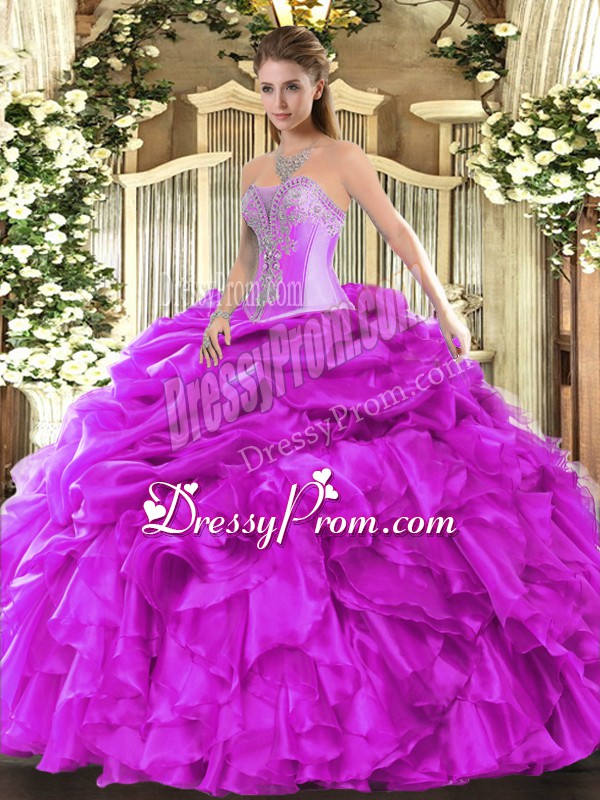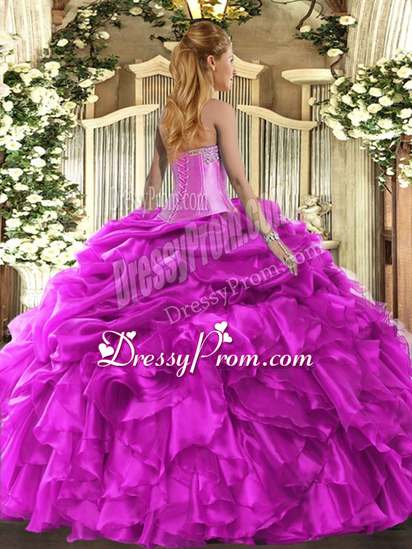 Neckline : SweetheartShown Color : FuchsiaSilhouette : Ball GownsSleeve Length : sleevelessHemline : floor lengthBack Detail : Lace upFabric : OrganzaEmbellishment : Beading,Ruffles,Pick UpsOccasion : Military Ball,Sweet 16,QuinceaneraSeason : Spring,Summer,Fall,Winter
