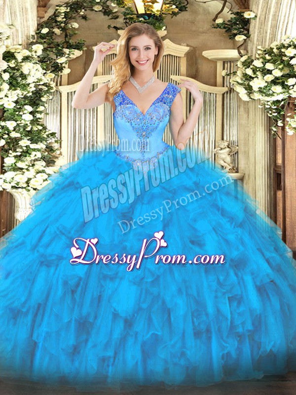 Neckline : V-neckShown Color : Baby BlueSilhouette : Ball GownsSleeve Length : sleevelessHemline : floor lengthBack Detail : Lace upFabric : OrganzaEmbellishment : Beading,RufflesOccasion : Military Ball,Sweet 16,QuinceaneraSeason : Spring,Summer,Fall,Winter