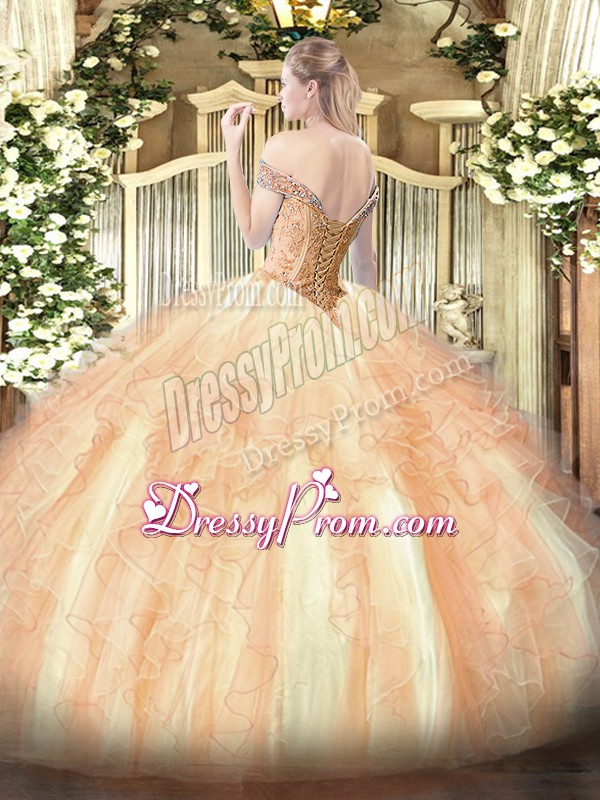 Neckline : Off the shoulderShown Color : Yellow GreenSilhouette : Ball GownsSleeve Length : sleevelessHemline : floor lengthBack Detail : Lace upFabric : TulleEmbellishment : Beading,RufflesOccasion : Military Ball,Sweet 16,QuinceaneraSeason : Spring,Summer,Fall,Winter