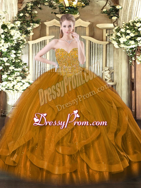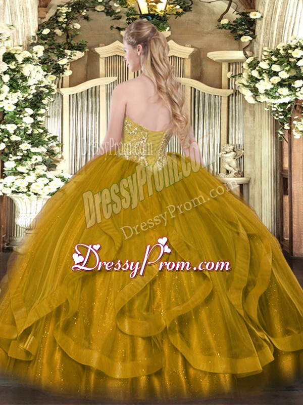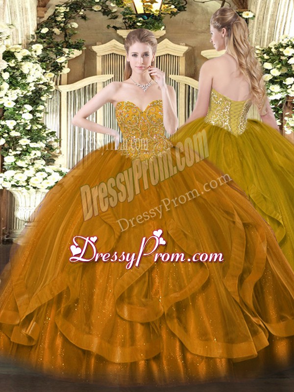 Neckline : SweetheartShown Color : GoldSilhouette : Ball GownsSleeve Length : sleevelessHemline : floor lengthBack Detail : Lace upFabric : OrganzaEmbellishment : Beading,RufflesOccasion : Military Ball,Sweet 16,QuinceaneraSeason : Spring,Summer,Fall,Winter