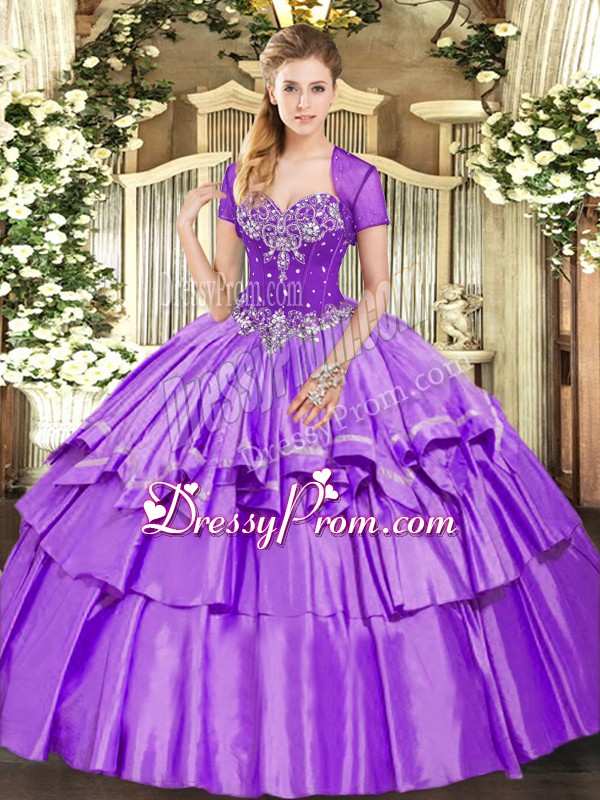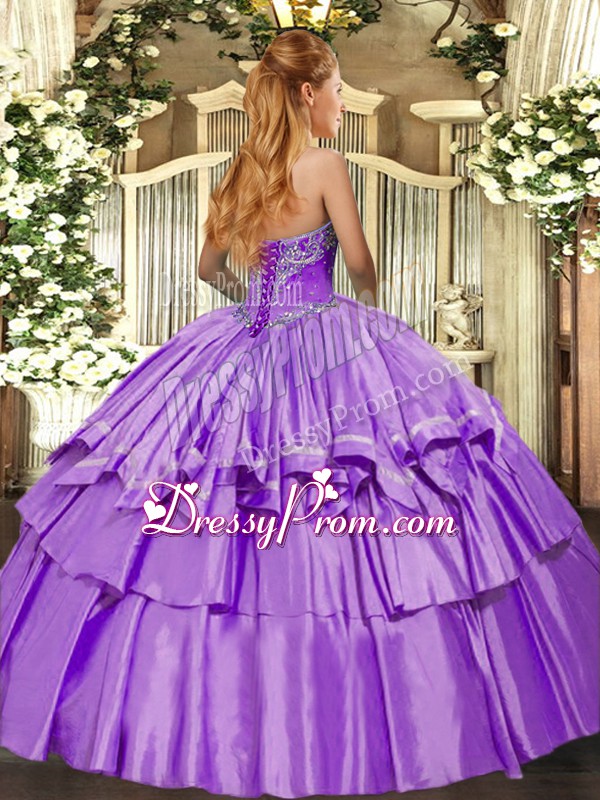 Neckline : SweetheartShown Color : LavenderSilhouette : Ball GownsSleeve Length : sleevelessHemline : floor lengthBack Detail : Lace upFabric : Organza,TaffetaEmbellishment : Beading,Ruffled LayersOccasion : Military Ball,Sweet 16,QuinceaneraSeason : Spring,Summer,Fall,Winter