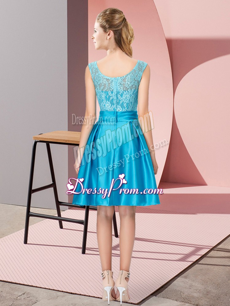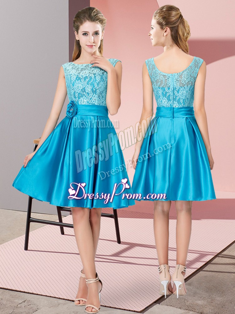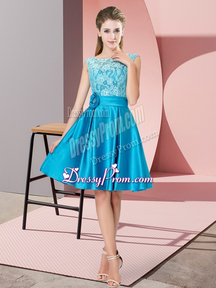 Neckline : BateauShown Color : BlueSilhouette : A-lineSleeve Length : sleevelessHemline : knee lengthBack Detail : ZipperFabric : SatinEmbellishment : Lace,Hand Made FlowerOccasion : Prom,PartySeason : Spring,Summer,Fall