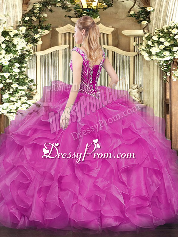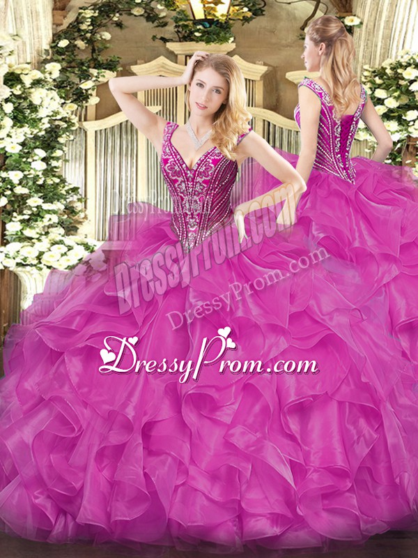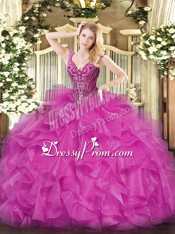 Neckline : V-neckShown Color : FuchsiaSilhouette : Ball GownsSleeve Length : long sleevesHemline : floor lengthBack Detail : Lace upFabric : OrganzaEmbellishment : Beading,RufflesOccasion : Military Ball,Sweet 16,QuinceaneraSeason : Spring,Summer,Fall,Winter