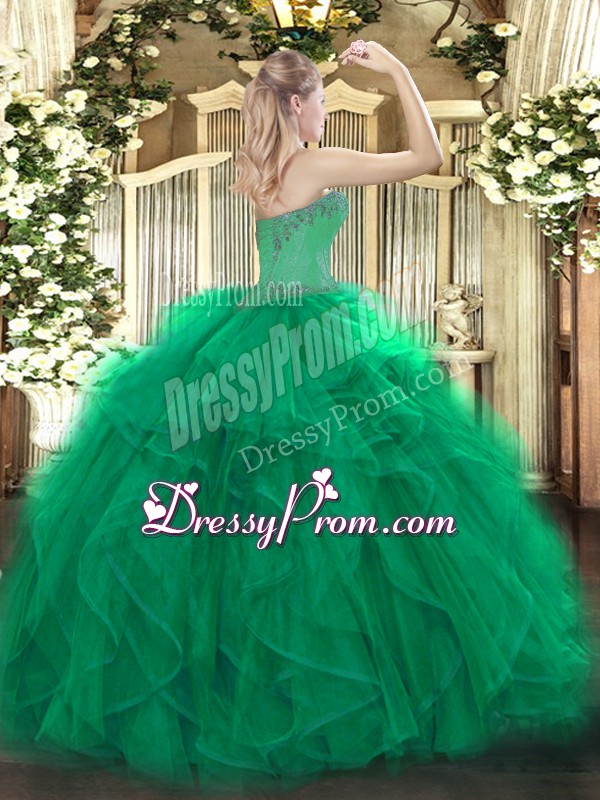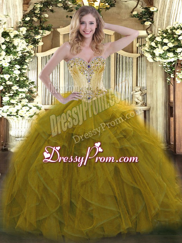 Neckline : SweetheartShown Color : Olive GreenSilhouette : Ball GownsSleeve Length : sleevelessHemline : floor lengthBack Detail : Lace upFabric : OrganzaEmbellishment : Beading,RufflesOccasion : Sweet 16,QuinceaneraSeason : Spring,Summer,Fall,Winter