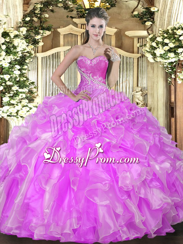 Neckline : SweetheartShown Color : LilacSilhouette : Ball GownsSleeve Length : sleevelessHemline : floor lengthBack Detail : Lace upFabric : OrganzaEmbellishment : Beading,RufflesOccasion : Military Ball,Sweet 16,QuinceaneraSeason : Spring,Summer,Fall,Winter