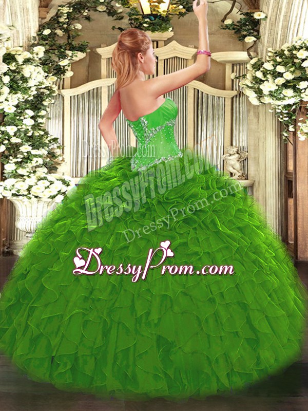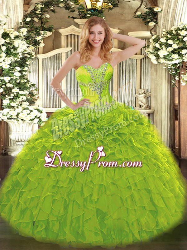 Neckline : SweetheartShown Color : Olive GreenSilhouette : Ball GownsSleeve Length : sleevelessHemline : floor lengthBack Detail : Lace upFabric : OrganzaEmbellishment : Beading,RufflesOccasion : Sweet 16,QuinceaneraSeason : Spring,Summer,Fall,Winter