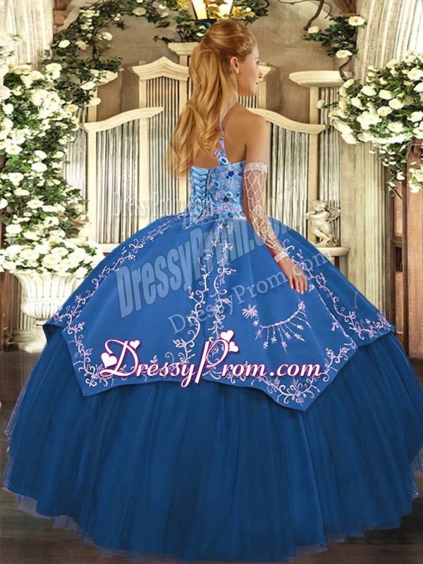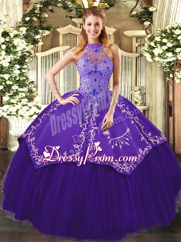 Neckline : Halter topShown Color : PurpleSilhouette : Ball GownsSleeve Length : sleevelessHemline : floor lengthBack Detail : Lace upFabric : TulleEmbellishment : Beading,EmbroideryOccasion : Sweet 16,QuinceaneraSeason : Spring,Summer,Fall,Winter