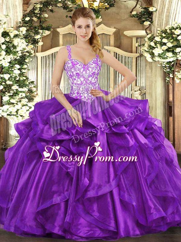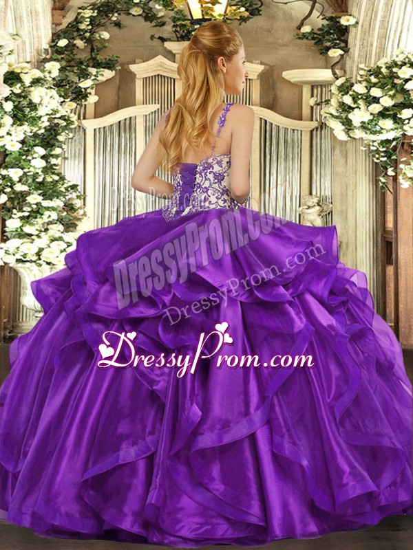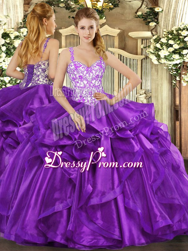 Neckline : StrapsShown Color : Eggplant PurpleSilhouette : Ball GownsSleeve Length : sleevelessHemline : floor lengthBack Detail : Lace upFabric : OrganzaEmbellishment : Beading,Appliques,RufflesOccasion : Sweet 16,QuinceaneraSeason : Spring,Summer,Fall,Winter