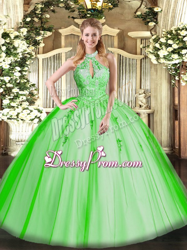 Neckline : Halter top Shown Color : Spring Green Silhouette : Ball Gowns Sleeve Length : sleeveless Hemline : floor length Back Detail : Lace up Fabric : Tulle Embellishment : Lace,Appliques Occasion : Military Ball,Sweet 16,Quinceanera Season : Spring,Summer,Fall,Winter