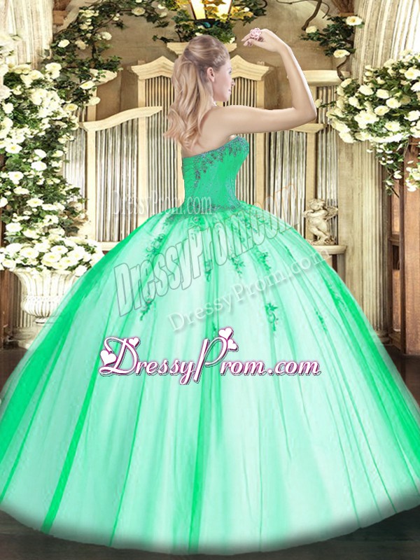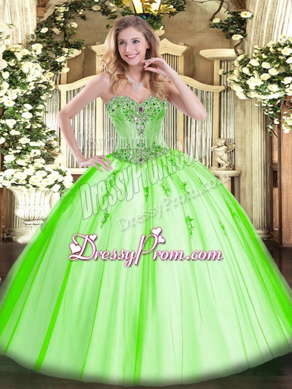 Neckline : SweetheartShown Color : Spring GreenSilhouette : Ball GownsSleeve Length : sleevelessHemline : floor lengthBack Detail : Lace upFabric : TulleEmbellishment : Beading,AppliquesOccasion : Sweet 16,QuinceaneraSeason : Spring,Summer,Fall,Winter