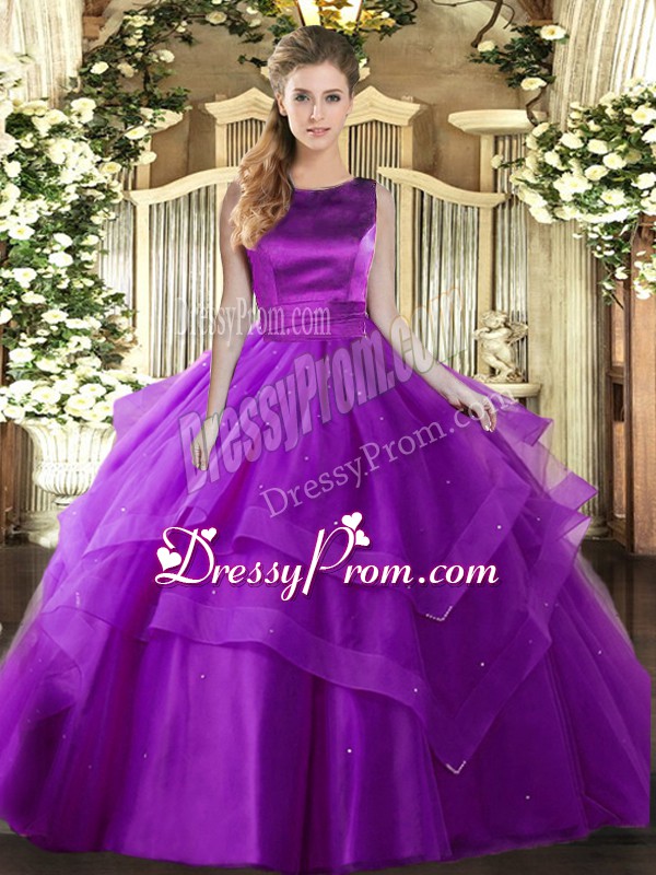 Neckline : ScoopShown Color : Eggplant PurpleSilhouette : Ball GownsSleeve Length : sleevelessHemline : floor lengthBack Detail : Lace upFabric : TulleEmbellishment : Ruffled LayersOccasion : Military Ball,Sweet 16,QuinceaneraSeason : Spring,Summer,Fall,Winter