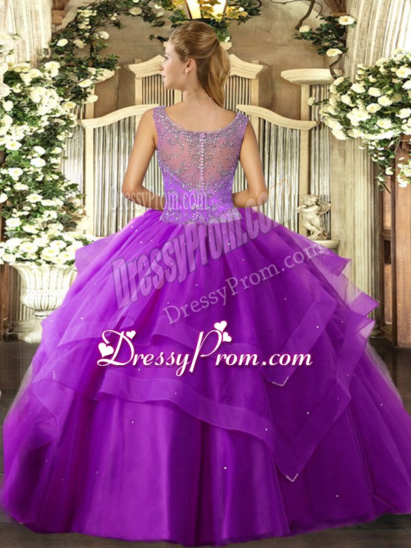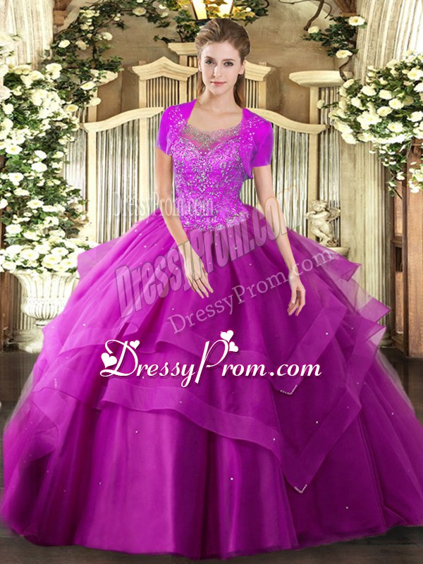 Neckline : ScoopShown Color : FuchsiaSilhouette : Ball GownsSleeve Length : sleevelessHemline : floor lengthBack Detail : Clasp handleFabric : TulleEmbellishment : Beading,RufflesOccasion : Military Ball,Sweet 16,QuinceaneraSeason : Spring,Summer,Fall,Winter