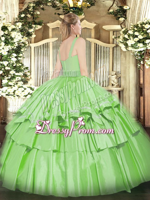 Neckline : StrapsShown Color : GreenSilhouette : Ball GownsSleeve Length : sleevelessHemline : floor lengthBack Detail : ZipperFabric : OrganzaEmbellishment : Beading,Ruffled LayersOccasion : Military Ball,Sweet 16,QuinceaneraSeason : Spring,Summer,Fall,Winter