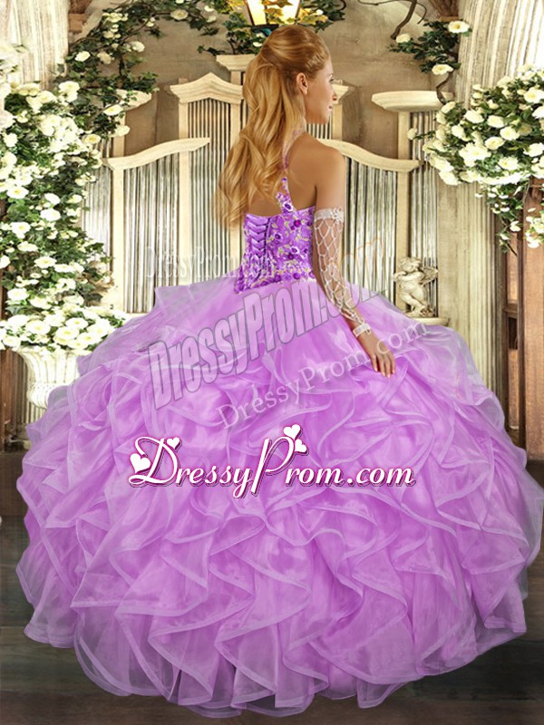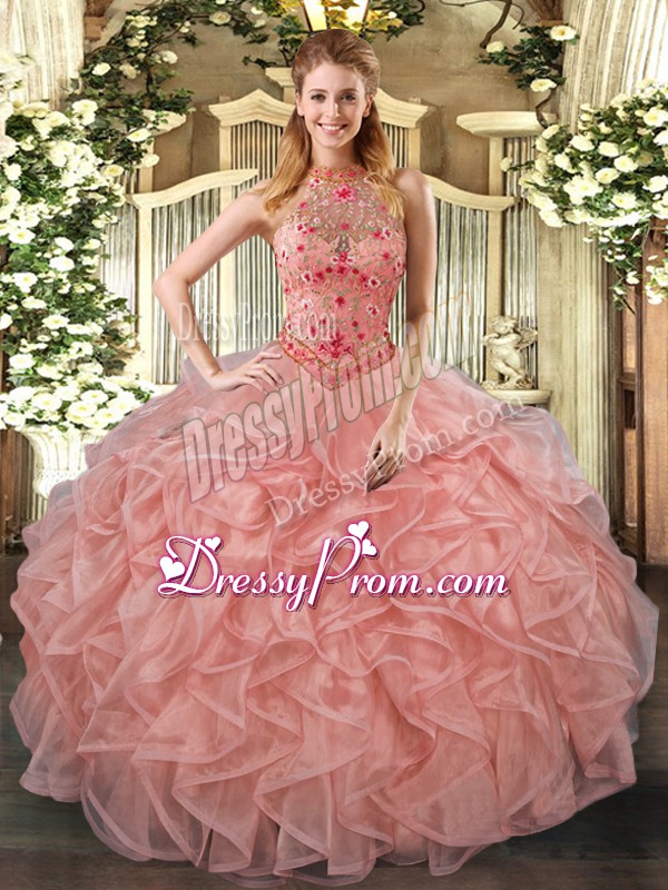 Neckline : Halter topShown Color : PeachSilhouette : Ball GownsSleeve Length : sleevelessHemline : floor lengthBack Detail : Lace upFabric : OrganzaEmbellishment : Beading,Embroidery,RufflesOccasion : Sweet 16,QuinceaneraSeason : Spring,Summer,Fall,Winter