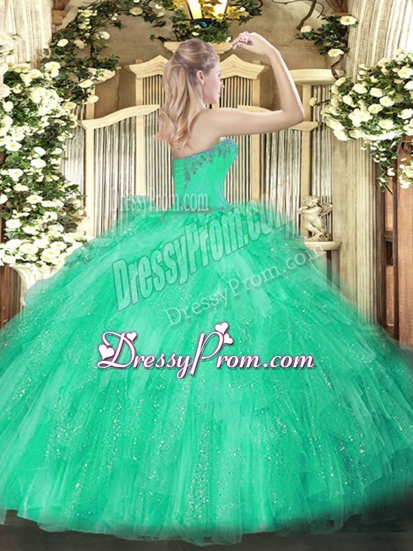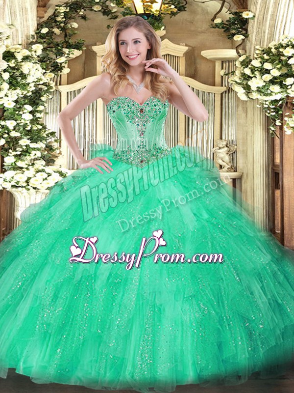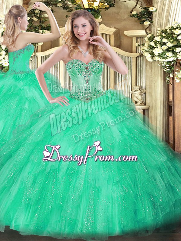 Neckline : SweetheartShown Color : Apple GreenSilhouette : Ball GownsSleeve Length : sleevelessHemline : floor lengthBack Detail : Lace upFabric : TulleEmbellishment : Beading,RufflesOccasion : Military Ball,Sweet 16,QuinceaneraSeason : Spring,Summer,Fall,Winter