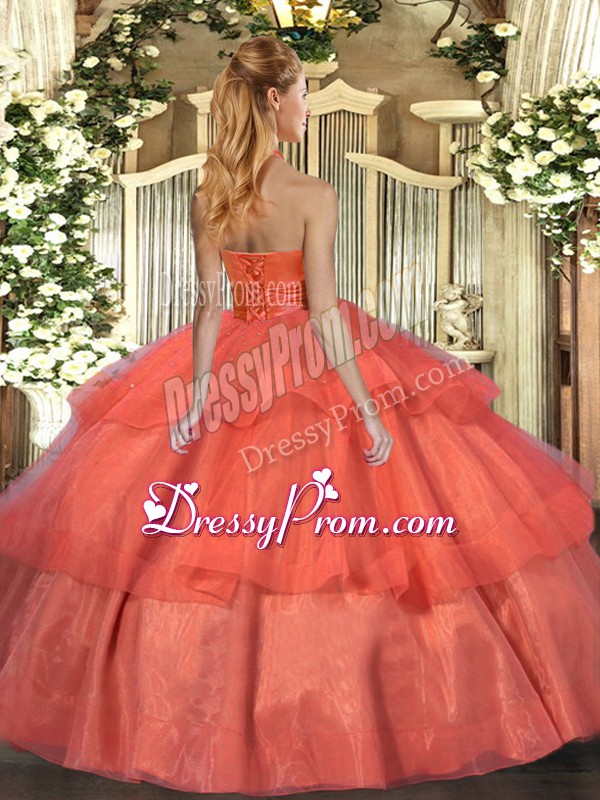 Neckline : Halter topShown Color : FuchsiaSilhouette : Ball GownsSleeve Length : sleevelessHemline : floor lengthBack Detail : Lace upFabric : TulleEmbellishment : Ruffled LayersOccasion : Military Ball,Sweet 16,QuinceaneraSeason : Spring,Summer,Fall,Winter