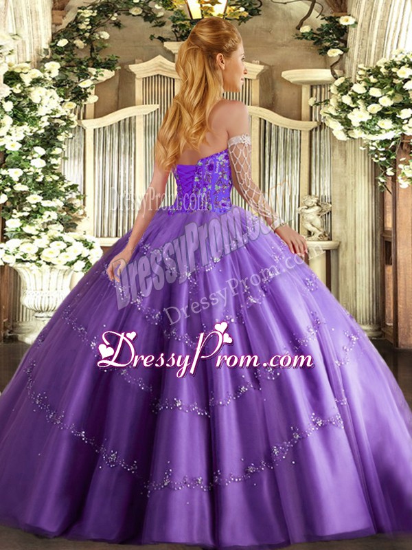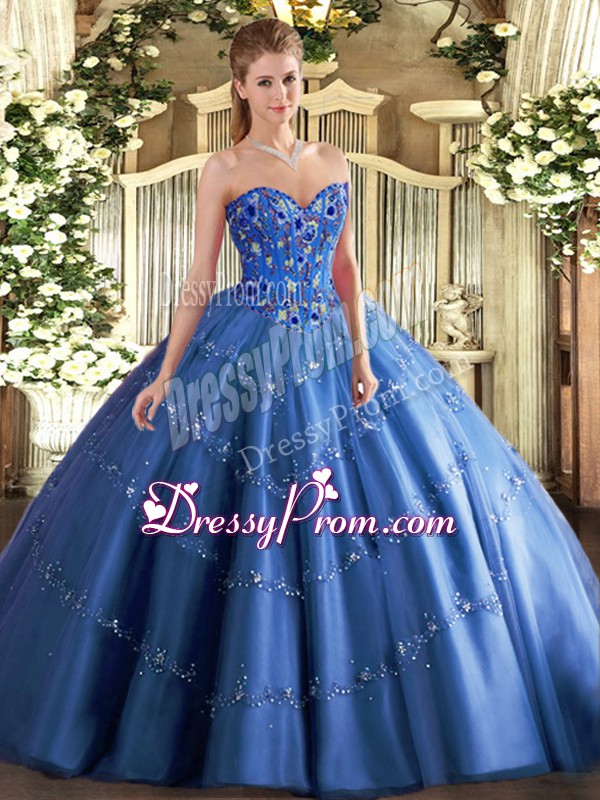 Neckline : SweetheartShown Color : BlueSilhouette : Ball GownsSleeve Length : sleevelessHemline : floor lengthBack Detail : Lace upFabric : TulleEmbellishment : Appliques,EmbroideryOccasion : Military Ball,Sweet 16,QuinceaneraSeason : Spring,Summer,Fall,Winter